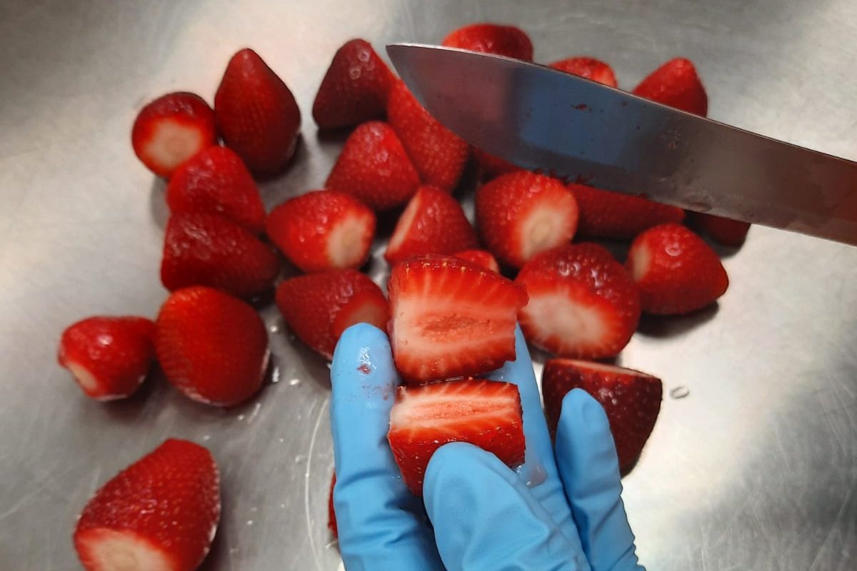 今回のジャムを作るのは、デイリーフーズ株式会社。1970年創業以来、数多くのジャムを作り続けている会社です。ジャム瓶から見える時も、使う時も、ごろごろとした果肉感が伝わるように、イチゴのカットは大きめにしています。甘さを控えて釜で炊き上げ、イチゴ本来の甘味とおいしさを最大限に引き出しました。